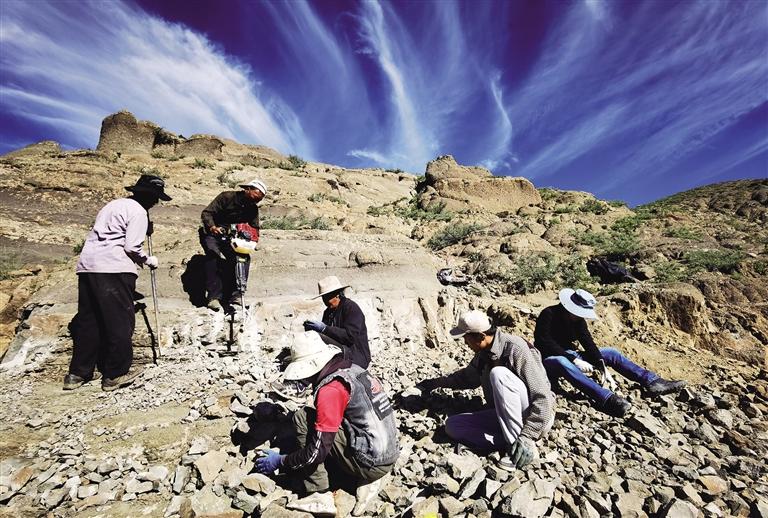 第二次青藏科考期間,中國科學(xué)院西雙版納熱帶植物園研究員蘇濤帶領(lǐng)的“生物與高原隆升協(xié)同演化”專題的科考分隊,從2017年開始在拉孜開展了多次考察研究,在西藏自治區(qū)科考辦和當?shù)卮迕竦膮f(xié)助下,最終在柳鄉(xiāng)發(fā)現(xiàn)了化石點并采集少量巖石樣品。
