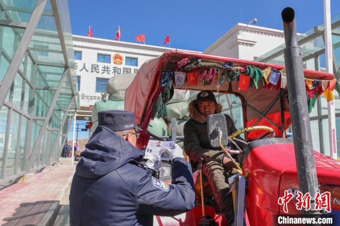 圖為里孜出入境邊防檢查站移民管理警察查驗(yàn)首臺(tái)通關(guān)車(chē)輛。郭遠(yuǎn)敬 攝