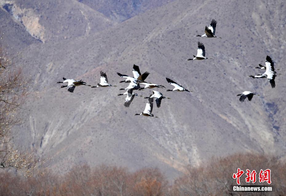 圖為11月21日,西藏日喀則市桑珠孜區(qū)邊雄鄉(xiāng),黑頸鶴振翅高飛。李林 攝
