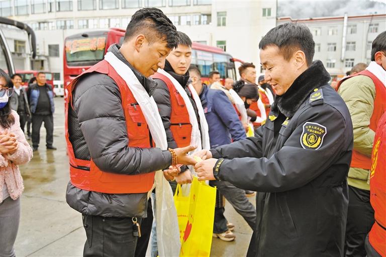 圖為啟動(dòng)儀式現(xiàn)場(chǎng),林芝市交通運(yùn)輸局交通綜合行政執(zhí)法隊(duì)工作人員為返鄉(xiāng)農(nóng)民工送上小禮品。西藏日?qǐng)?bào)記者 謝筱純 攝