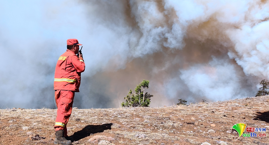 楊飛在森林火災(zāi)現(xiàn)場(chǎng)。林芝市森林消防支隊(duì)供圖