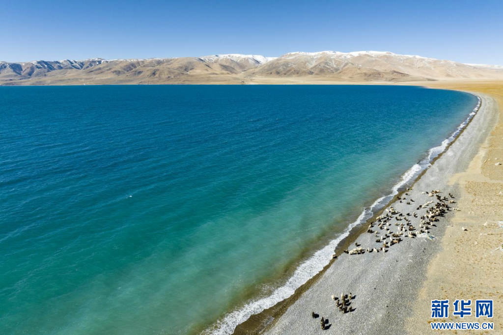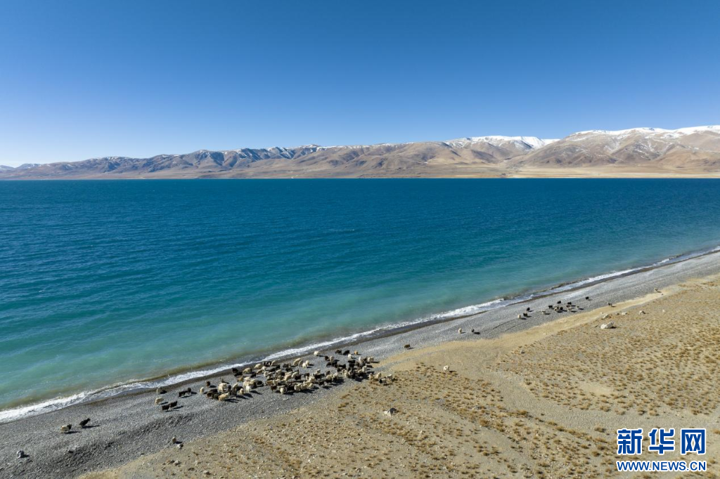 12月20日拍攝的當惹雍錯湖畔的羊群(無人機照片)。新華網 旦增努布 攝