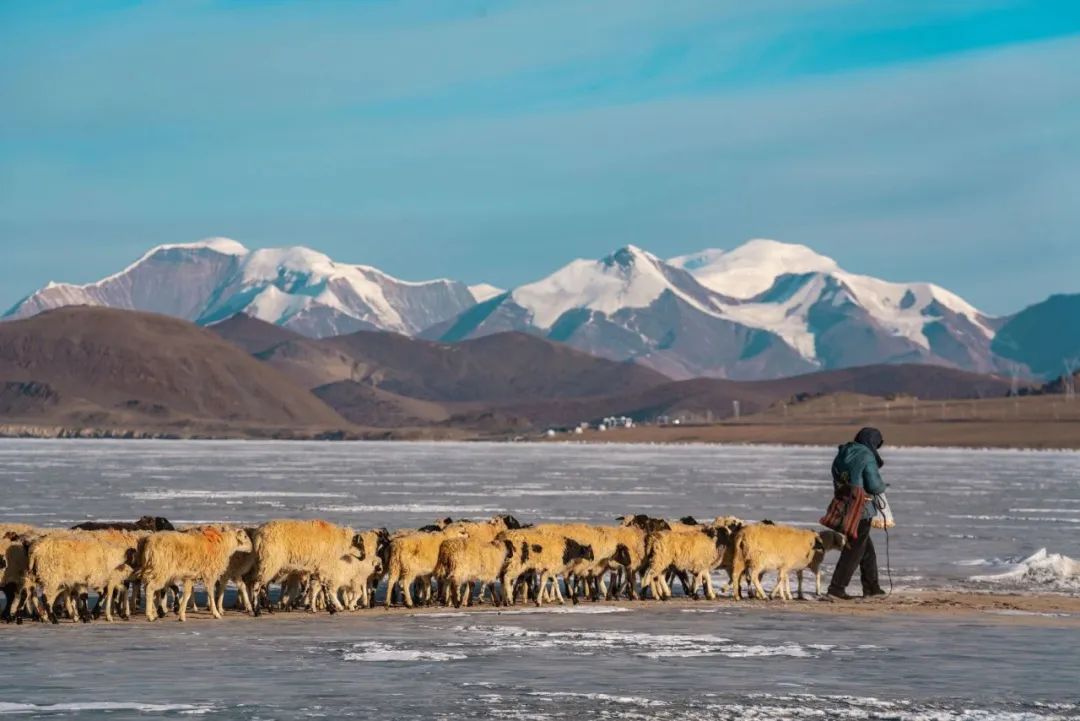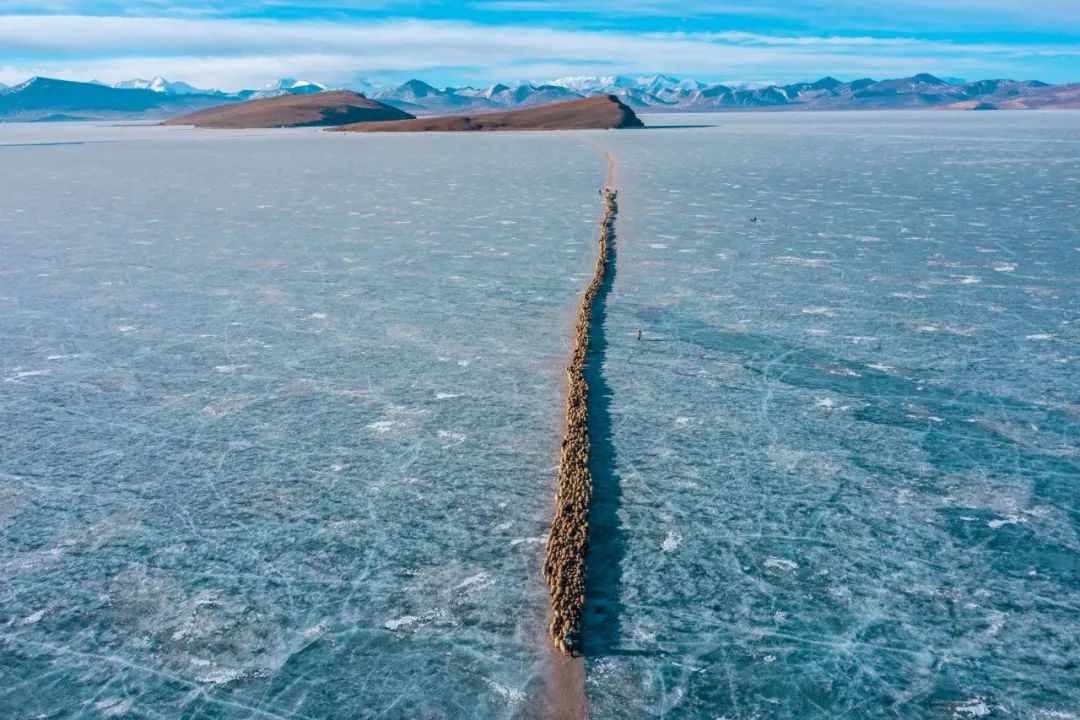 它是世界上海拔最高的村落之一,當地村民都以放牧為生。寒冬來臨,岸上的牧場草料已經不夠羊群過冬,推瓦村的村民們把羊群集結在一起,在冰湖上撒牛糞爐灰,畫出一道冰面上的“羊腸小道”把羊群趕上普姆雍錯湖心島上吃草過冬,雖然只有幾公里的距離,但這個傳承千年的畫面卻給人以史詩般的震撼與感動。