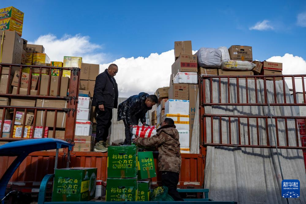 申扎縣供銷合作社員工在拉薩為偏遠(yuǎn)鄉(xiāng)鎮(zhèn)果蔬配送試點項目的貨車上貨(1月2日攝)。新華社記者 姜帆 攝
