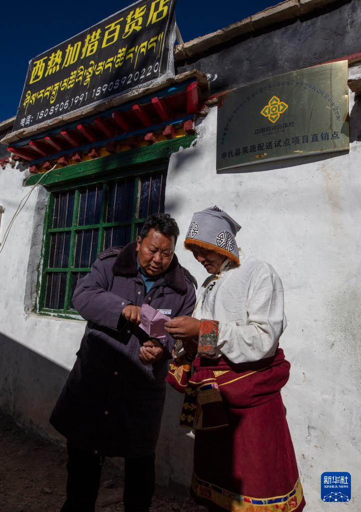 申扎縣供銷合作社的配送負(fù)責(zé)人吳瓦(左)與馬躍鄉(xiāng)貝嘎四村偏遠(yuǎn)鄉(xiāng)鎮(zhèn)果蔬配送試點項目直銷點店主西熱加措核對配送清單(1月5日攝)。新華社記者 姜帆 攝