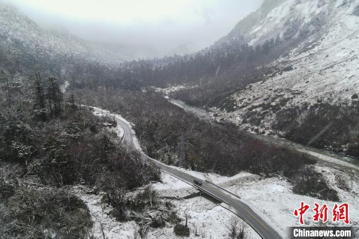 圖為2023年12月18日,大雪中的西藏墨脫扎墨公路。(無人機(jī)畫面)中新社記者 江飛波 攝