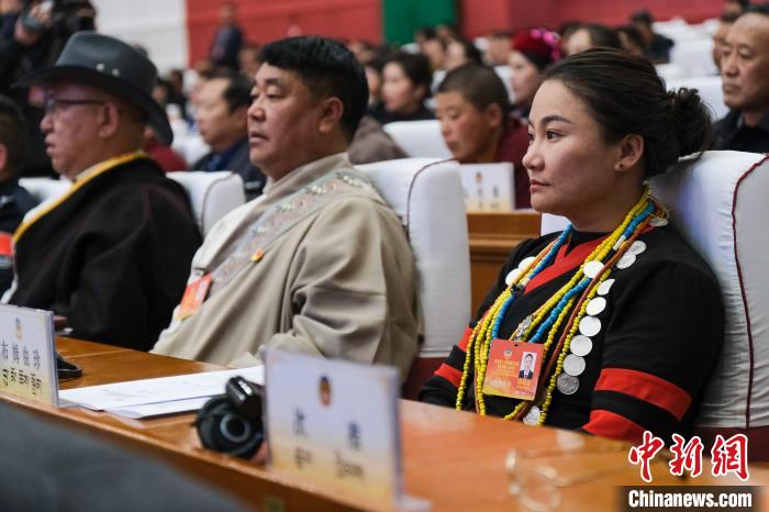 1月9日,西藏少數(shù)民族界政協(xié)委員、墨脫縣達(dá)木珞巴民族鄉(xiāng)鄉(xiāng)長布姆曲珍(右一)在西藏自治區(qū)兩會(huì)現(xiàn)場。中新社記者 江飛波 攝