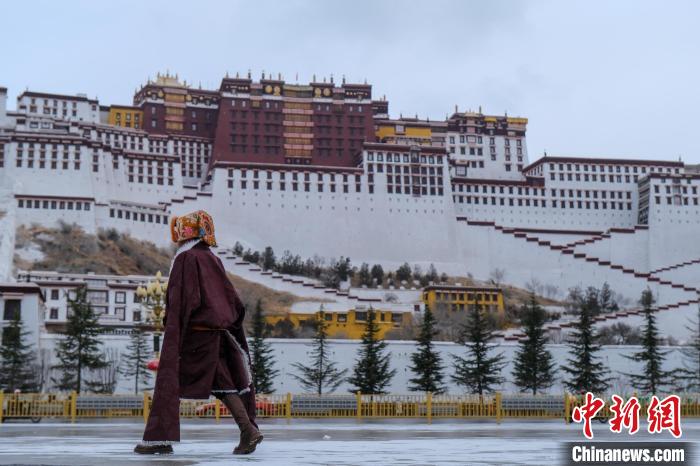 1月16日,西藏拉薩迎來2024年首場降雪,圖為民眾途經(jīng)雪后的布達(dá)拉宮廣場。江飛波 攝