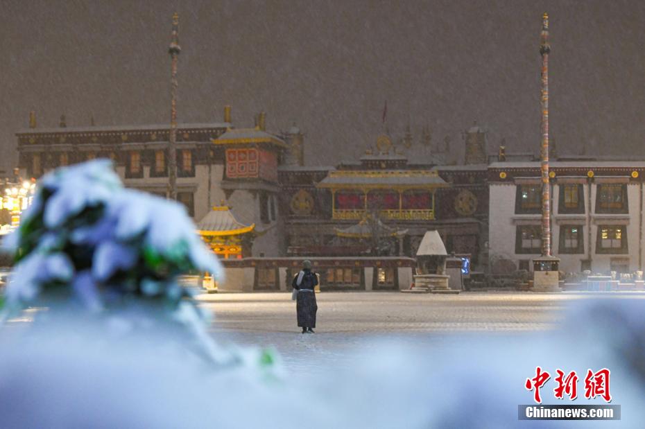 圖為雪后信眾在拉薩市大昭寺前朝拜。