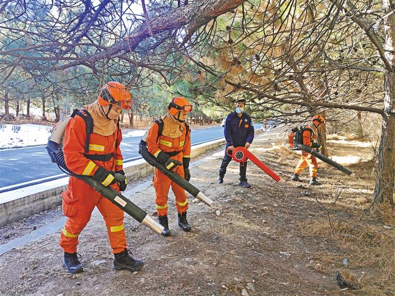 圖為森林消防員們在巴河鎮(zhèn)周邊開展林下可燃物清理工作。記者 張猛 攝