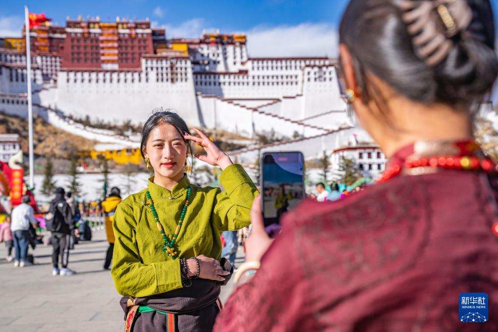 2月11日,來自四川甘孜的游客在布達(dá)拉宮廣場上拍照留念。新華社記者 孫非 攝