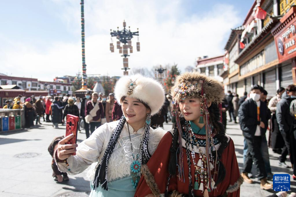 2月11日,在西藏拉薩八廓街,游客在游玩時(shí)拍攝視頻。新華社記者 孫瑞博 攝