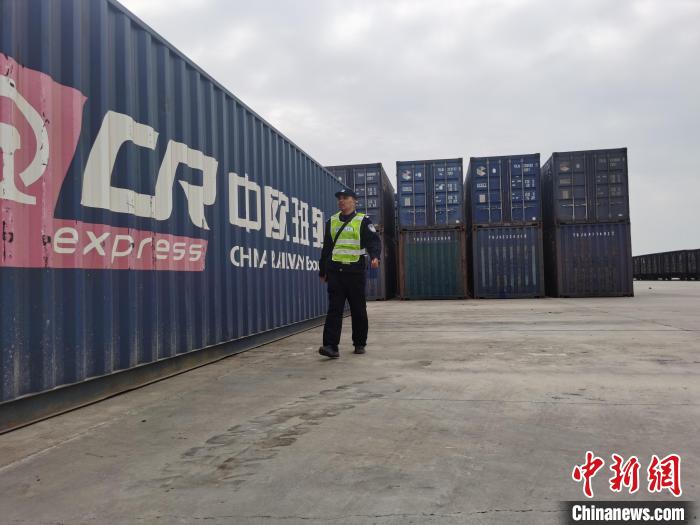 袁倫在中歐班列集裝箱區(qū)域開展巡邏。黃巍 攝