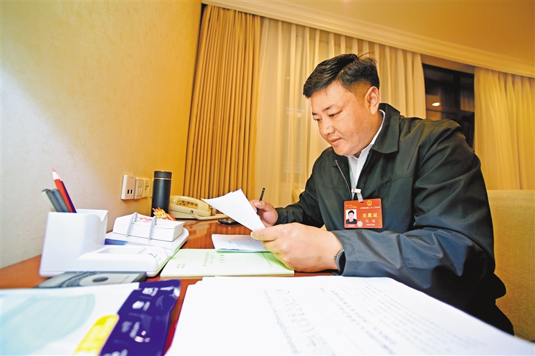 圖為全國(guó)人大代表拉瓊在會(huì)前完善發(fā)言材料。