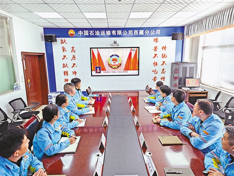 中國石油運輸西藏分公司組織員工收看全國政協(xié)十四屆二次會議開幕會。格桑旦增 記者 次仁平措 攝