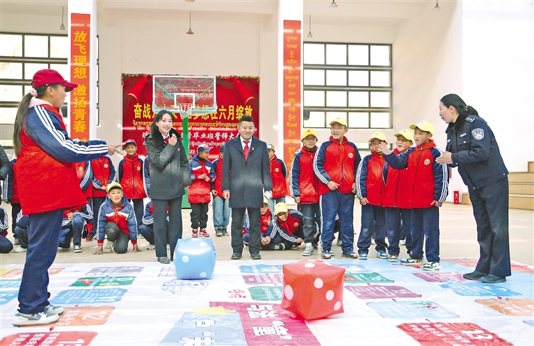 圖為3月5日,瓊結(jié)縣人民法院干警們?cè)诃偨Y(jié)鎮(zhèn)完全小學(xué)用游戲方式開展“法治第一課”活動(dòng)。倫珠澤仁 記者 洛桑 攝