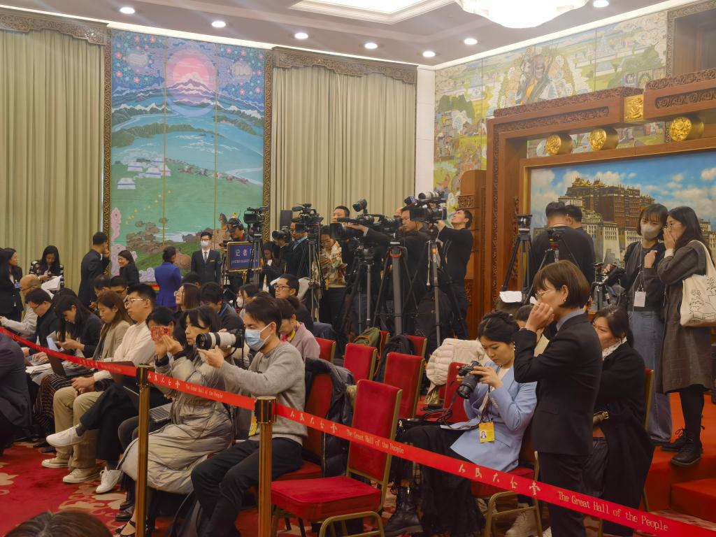 3月6日下午,中外記者在人民大會堂西藏廳參加十四屆全國人大二次會議西藏代表團開放團組活動。(新華社記者韓潔 攝)