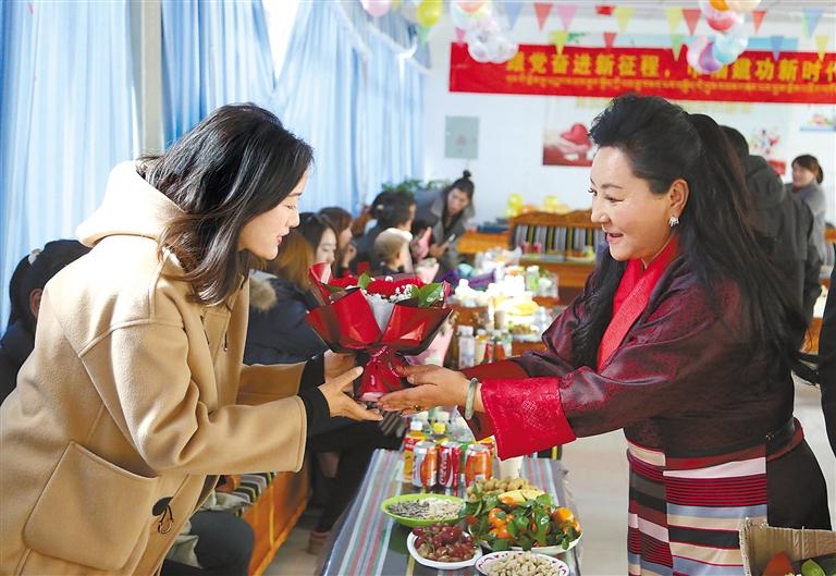 “三八”國(guó)際勞動(dòng)?jì)D女節(jié)來臨之際,山南市瓊結(jié)縣中心醫(yī)院組織醫(yī)院婦女職工一起慶祝節(jié)日。圖為瓊結(jié)縣中心醫(yī)院院長(zhǎng)巴桑潘多(右)為醫(yī)院婦女職工獻(xiàn)上鮮花。 倫珠澤仁 洛桑 攝
