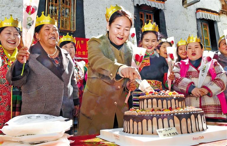 為進(jìn)一步豐富社區(qū)婦女同胞的精神文化生活,展示社區(qū)巾幗風(fēng)采,3月8日,拉薩市策門林社區(qū)和藥王山社區(qū)共同舉辦了“巾幗心向黨 奮進(jìn)新征程‘三八’國(guó)際勞動(dòng)?jì)D女節(jié)”活動(dòng),轄區(qū)婦女歡聚一堂,慶祝節(jié)日。圖為轄區(qū)女性共同切蛋糕慶祝節(jié)日。 旦增蘭澤 攝