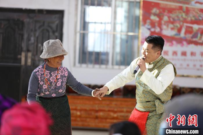 圖為演出中,西藏出入境邊防檢查總站文藝骨干與阿里地區(qū)扎西崗鄉(xiāng)群眾互動?!『『?攝