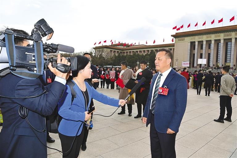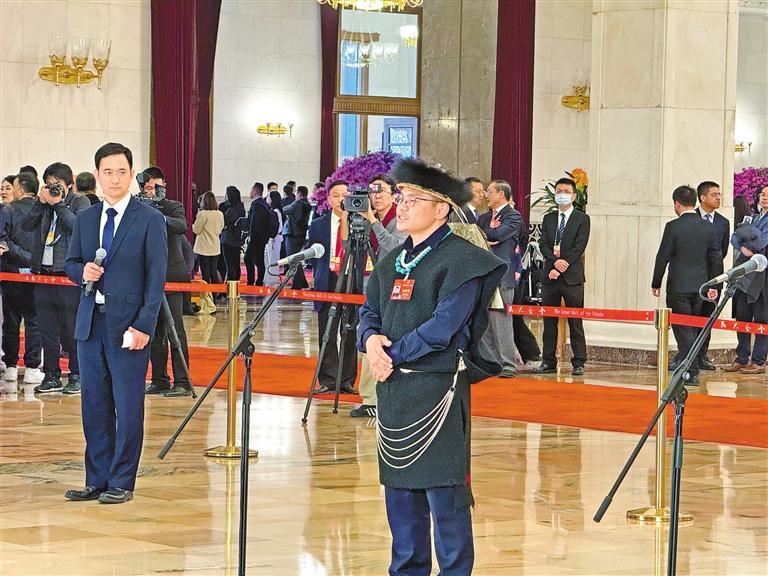 圖為西藏全國(guó)人大代表扎西江村在“代表通道”回答記者提問。