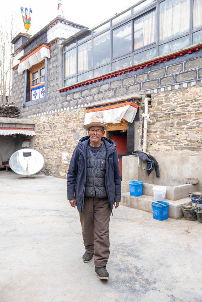 次旦說,平時二女兒央金在家照顧他的生活,女婿外出務(wù)工。次旦老人生活閑適,村里一有文藝演出,他就過去觀看。