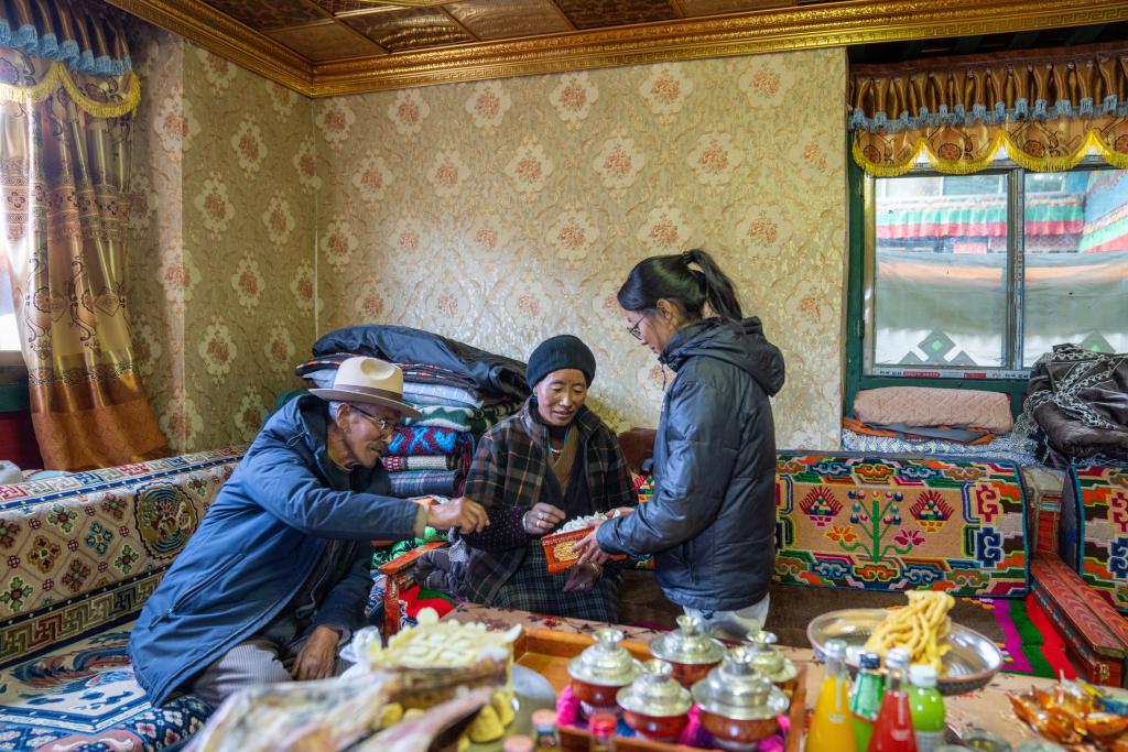次旦一家人正在分享零食(2月22日攝)。新華社記者 旦增尼瑪曲珠 攝