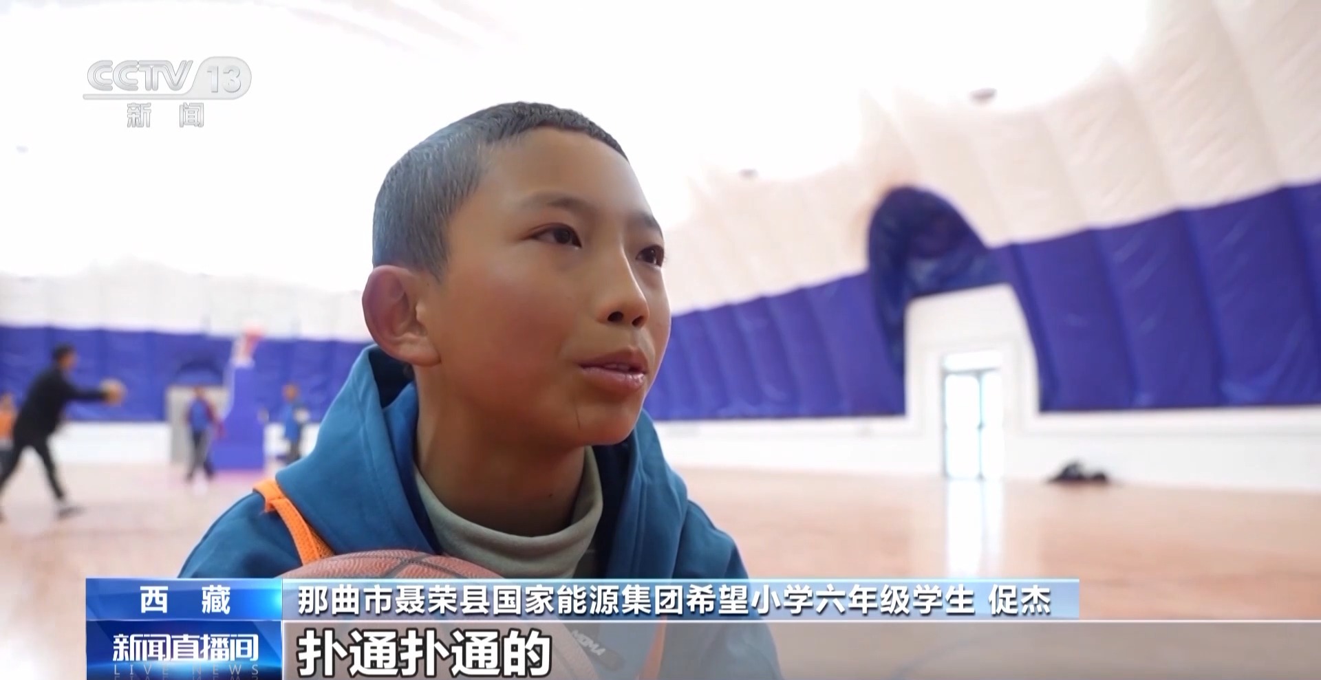 正在新球館進行籃球訓練的促杰,是聶榮縣國家能源集團希望小學六年級學生。他的家在離縣城18公里的色慶鄉(xiāng),平常住在學校。從三年級開始,促杰開始喜歡上籃球。然而,這里高寒缺氧,晝夜溫差大,全年日均最高溫僅7攝氏度,孩子們無法進行長時間的訓練。此前學校僅有的露天球場,更是常常受天氣影響,無法使用。