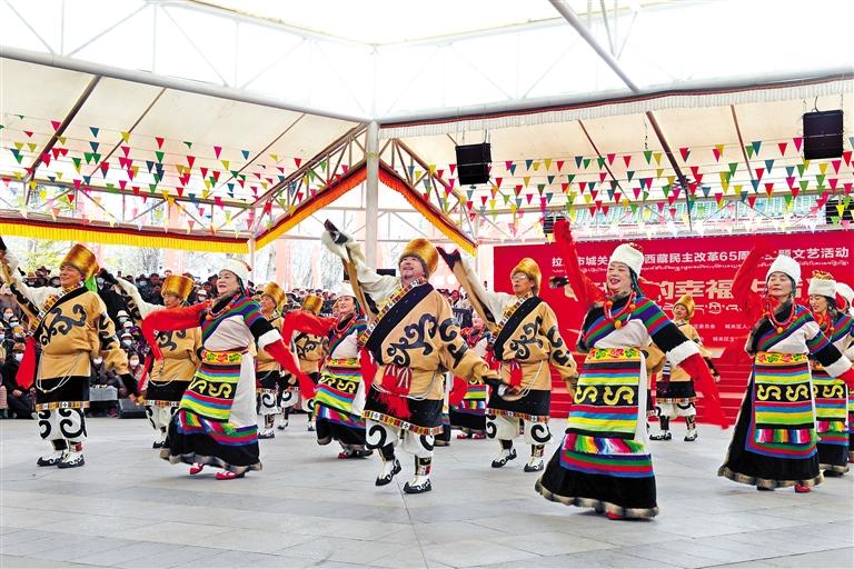 3月25日,由拉薩市城關(guān)區(qū)委、區(qū)政府主辦,城關(guān)區(qū)委宣傳部承辦的“我們的幸福生活”紀(jì)念西藏民主改革65周年文藝活動(dòng),在宗角祿康公園舉行?;顒?dòng)在開場(chǎng)歌舞《美麗的西藏·可愛的家鄉(xiāng)》中拉開序幕,現(xiàn)場(chǎng)觀眾熱情高漲,隨著歌舞旋律的起伏,不時(shí)報(bào)以熱烈的掌聲。此次文藝活動(dòng)充分展現(xiàn)了高原各族兒女對(duì)中國(guó)共產(chǎn)黨、偉大祖國(guó)和新時(shí)代的感恩之情。城關(guān)區(qū)委宣傳部常務(wù)副部長(zhǎng)王全勝表示:“通過搭建文藝演出平臺(tái),各族群眾能夠一展才藝、分享幸福生活,讓大家零距離參與文化活動(dòng),既豐富了人民群眾的精神文化生活,又激發(fā)了大家共建幸福新西藏的熱情?!?/p>
