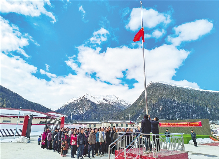 3月28日,米林市里龍鄉(xiāng)才巴村朗貢搬遷點(diǎn)的群眾舉行紀(jì)念西藏百萬農(nóng)奴解放65周年升國旗儀式。周宇 記者 丹增群培 攝