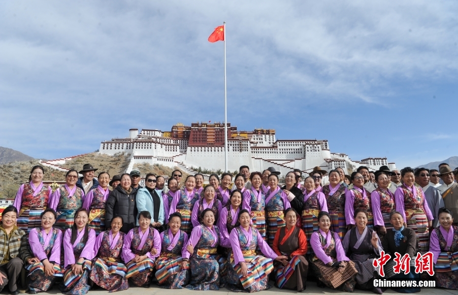 3月28日,西藏各族各界人士聚集在拉薩布達拉宮廣場,升國旗、唱國歌,參加西藏百萬農(nóng)奴解放65周年紀(jì)念活動。圖為民眾身著盛裝在布達拉宮廣場留影。中新社記者 貢嘎來松 攝