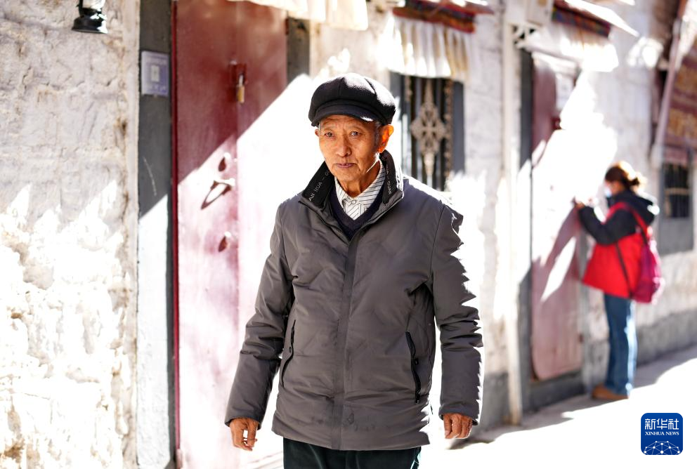 洛桑貢布途經(jīng)拉薩市老城區(qū)的巷道回家(3月27日攝)。
