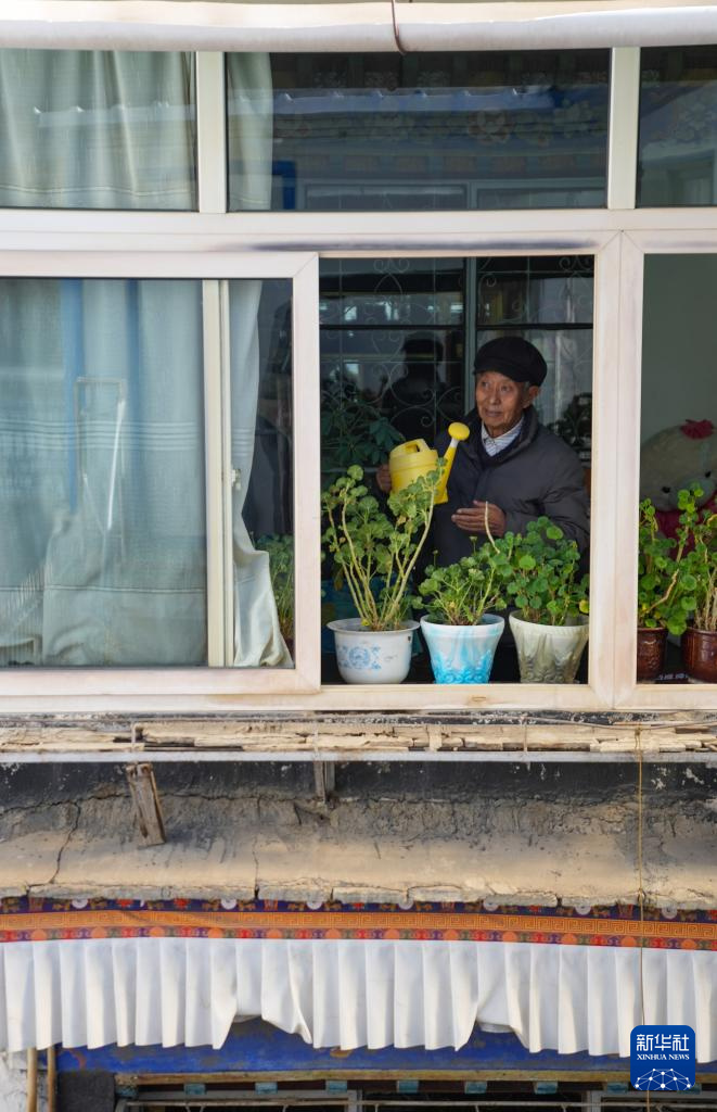 洛桑貢布在自家二樓陽(yáng)臺(tái)澆花(3月27日攝)。