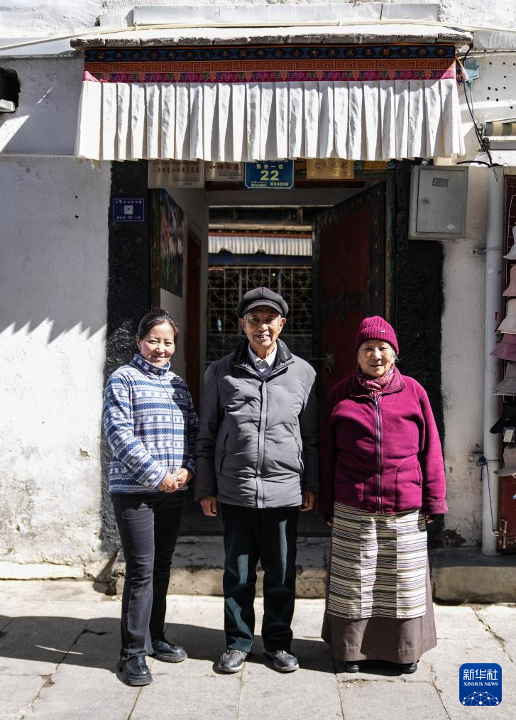 洛桑貢布(中)和大兒媳央金(左)、老伴次仁白姆在家門(mén)口前合影(3月27日攝)。