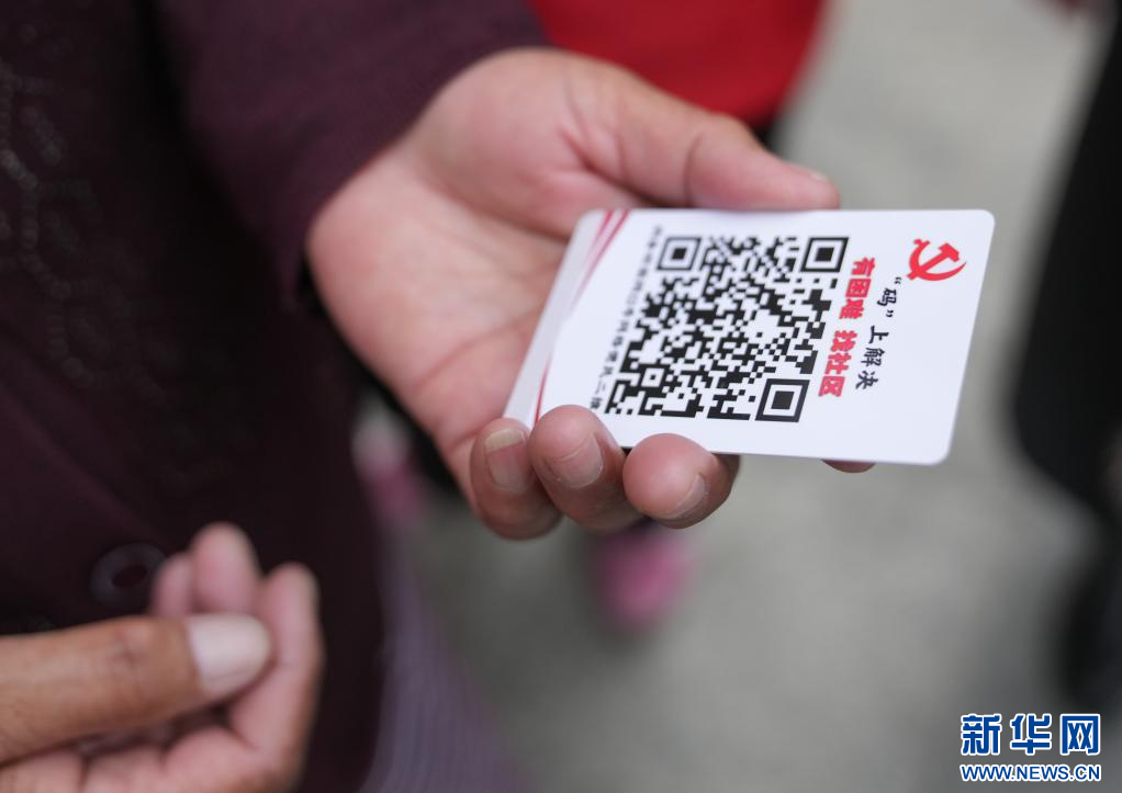 4月2日,納金村工作人員在粘貼網(wǎng)格便民二維碼。(新華社記者 晉美多吉 攝)