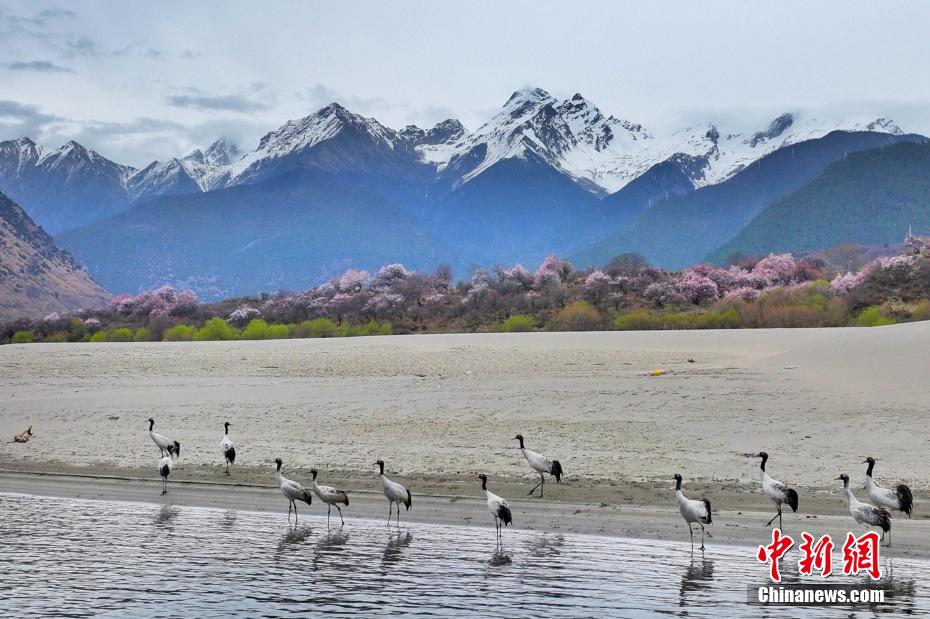4月,在西藏林芝,遠(yuǎn)處的雪山、綻放的桃花和水邊休憩的黑頸鶴構(gòu)成一幅和諧美好的春日畫(huà)卷。圖為林芝市派鎮(zhèn)拍攝到的黑頸鶴。