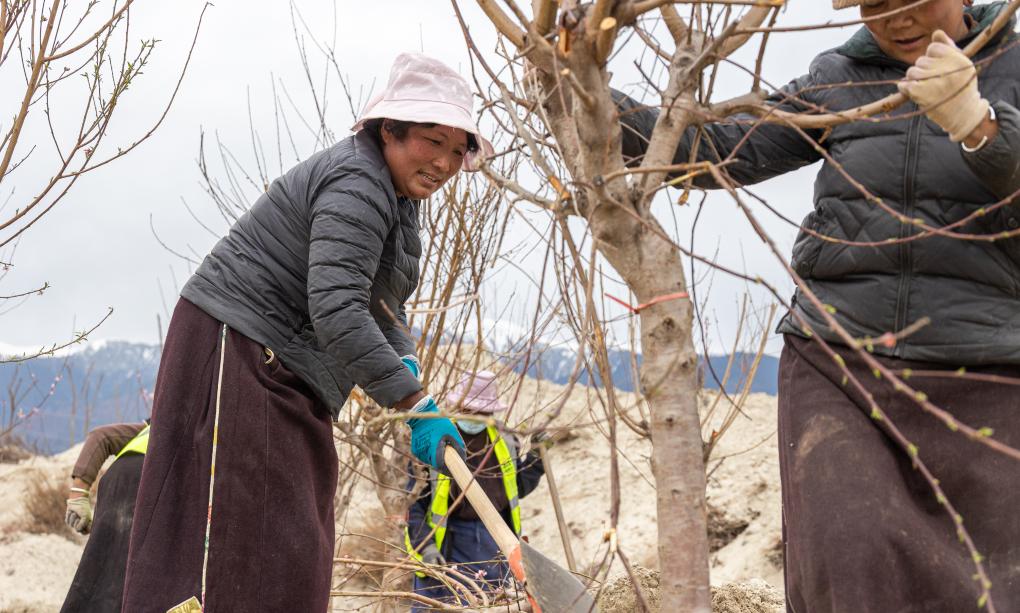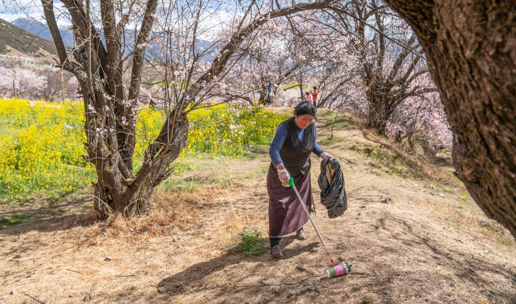 尼瑪曲吉在嘎拉村桃花園里撿拾垃圾(4月1日攝)。新華社記者 丁增尼達 攝