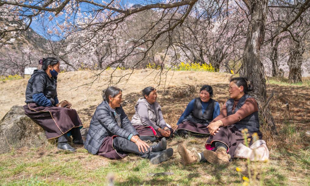 午休時,尼瑪曲吉(右二)與村民在桃樹下聊天(4月1日攝)。新華社記者 丁增尼達 攝