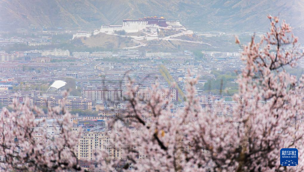 在位于拉薩北部的古剎帕邦喀附近拍攝的盛開的桃花,遠處是布達拉宮(4月9日攝)。新華社記者 丁增尼達 攝