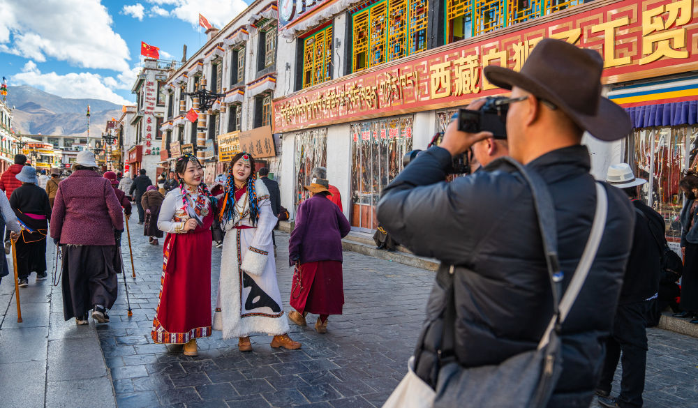 游客在八廓街街道上拍照留念。新華社記者 丁增尼達(dá) 攝