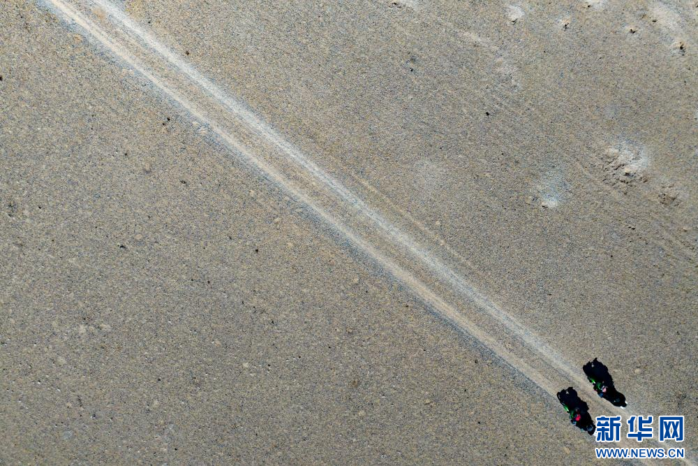 4月14日,野保員在色林錯(cuò)國(guó)家級(jí)自然保護(hù)區(qū)進(jìn)行日常巡邏(無(wú)人機(jī)照片)。新華網(wǎng) 旦增努布 攝