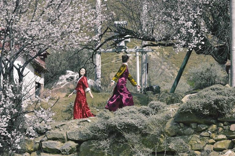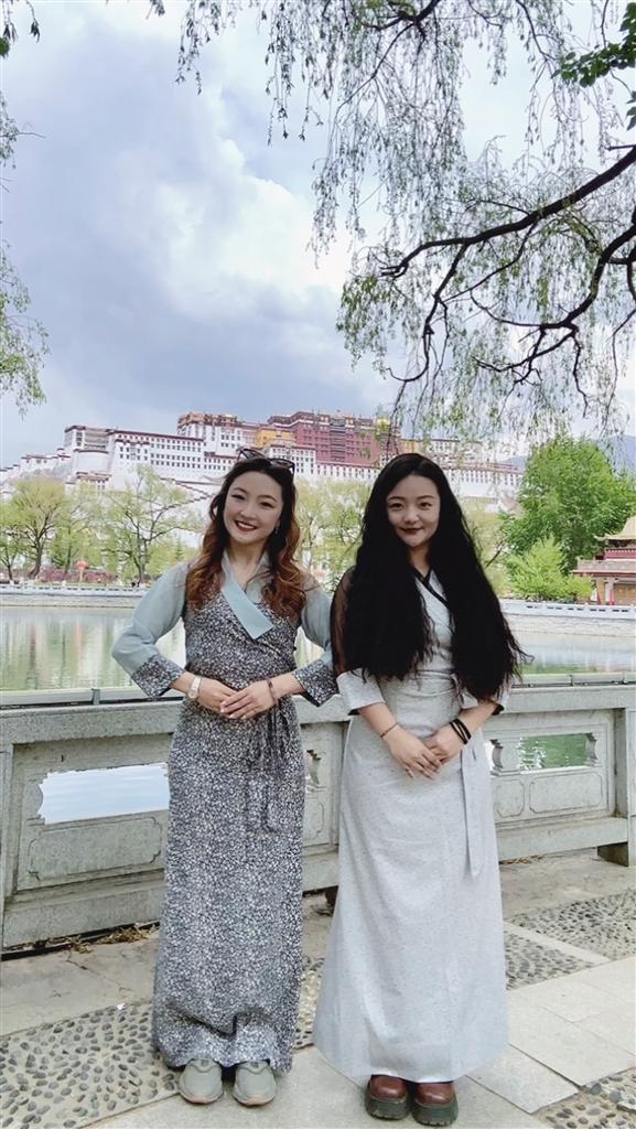 八廓街內(nèi),布宮圍墻邊,帕崩崗桃花樹下……游走在拉薩各個景點,你會發(fā)現(xiàn)眾多身著藏裝的漂亮姑娘,她們大多是來自全國各地的游客。藏裝布料精美、顏色亮麗,樣式傳統(tǒng)或新穎,配上頭飾耳飾,衣香鬢影、搖曳生姿。她們穿著藏裝賞景、拍照留念,亦成為別人眼中的風景。