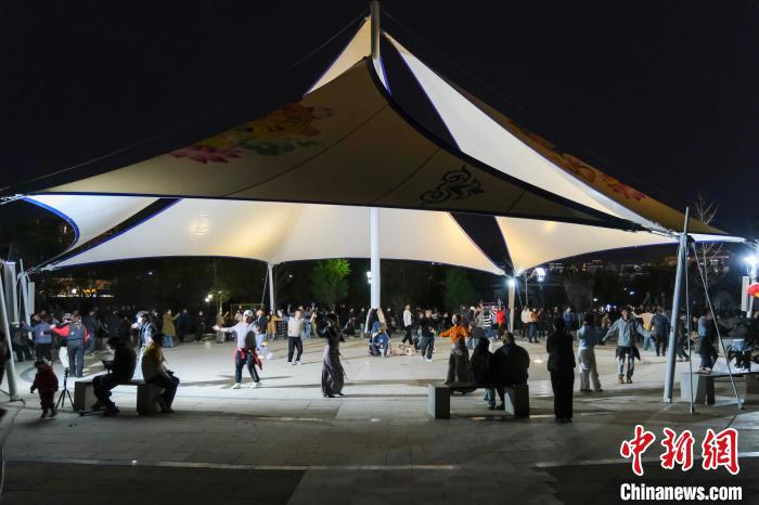 4月26日晚,在拉薩柳梧中心公園跳鍋莊舞的市民,現(xiàn)場(chǎng)熱鬧非常?!≈行律缬浾?江飛波 攝