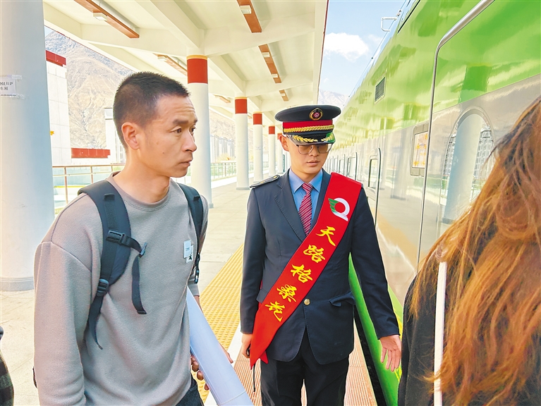 圖為山南火車站工作人員引導(dǎo)旅客有序進(jìn)入復(fù)興號(hào)動(dòng)車。記者 武沛濤 攝