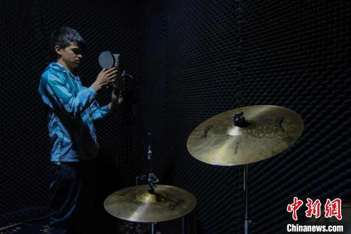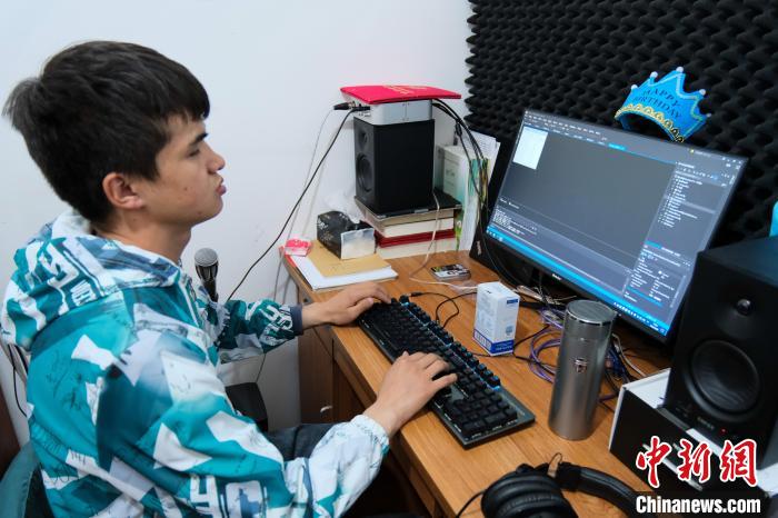 4月28日,尼瑪平措在公司的小錄音棚內調整錄音設備,他們團隊可以提供歌曲錄制服務。中新社記者 江飛波 攝