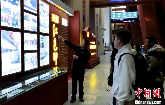 拉薩車(chē)站客運(yùn)運(yùn)轉(zhuǎn)車(chē)間主任候占元帶領(lǐng)候車(chē)旅客參觀車(chē)站的愛(ài)國(guó)主義教育基地文化長(zhǎng)廊。旅客們?cè)谶@里聆聽(tīng)了青藏鐵路發(fā)展史、青藏鐵路人的奮斗故事。