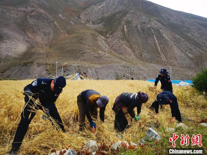 圖為貢當邊境派出所民警幫助當?shù)剞r(nóng)民秋收。日喀則邊境管理支隊供圖