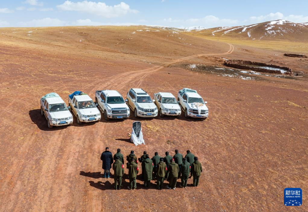 野生動(dòng)物專業(yè)管護(hù)隊(duì)員在無(wú)人區(qū)深處的羅布玉杰烈士紀(jì)念碑前默哀致敬。羅布玉杰2002年在與盜獵分子的槍?xiě)?zhàn)中犧牲(無(wú)人機(jī)照片,5月10日攝)。新華社記者 姜帆 攝