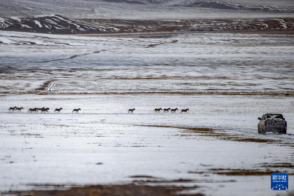 成群的藏野驢從野生動(dòng)物專業(yè)管護(hù)隊(duì)員們的車前跑過(guò)(5月9日攝)。新華社記者 姜帆 攝
