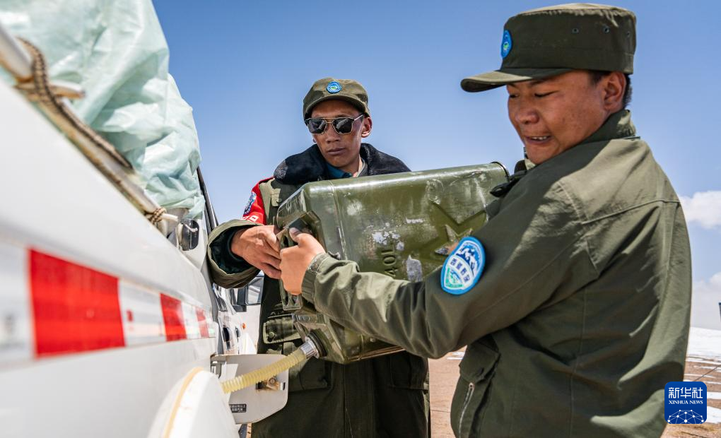 野生動(dòng)物專業(yè)管護(hù)隊(duì)員在巡護(hù)途中給車輛加油(5月9日攝)。新華社記者 丁增尼達(dá) 攝
